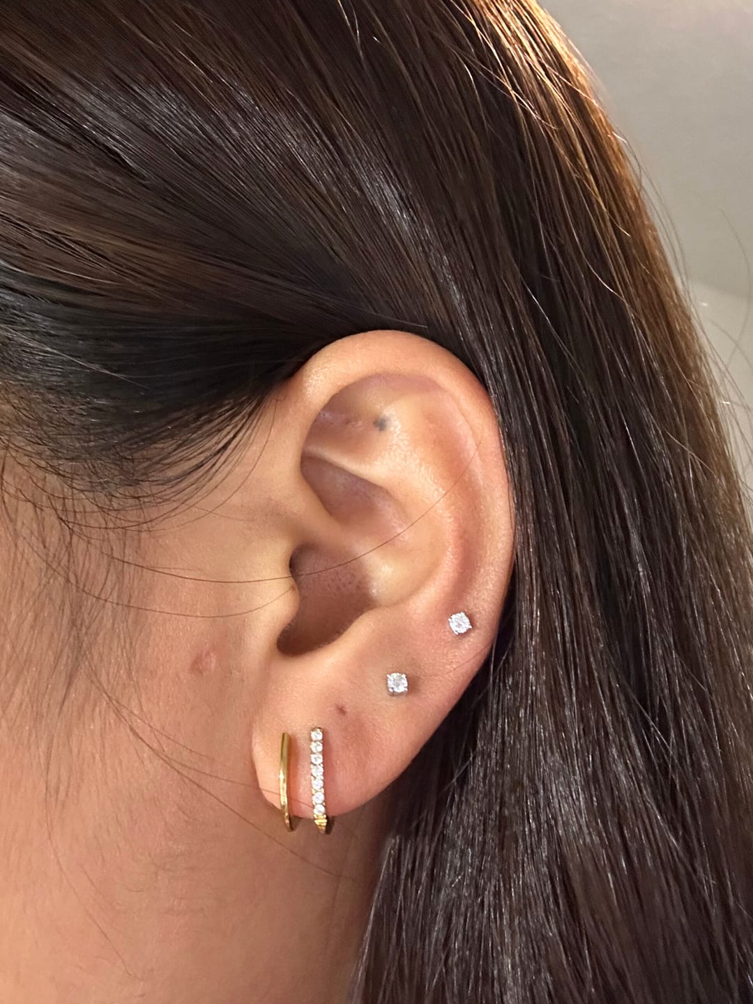 I love these! They’re the perfect size. I wear them in my second piercing and it makes it look like I have three. It’s the perfect accent earring and I like to wear them with the gold rectangle hoop earrings. I also have sensitive ears, and while these did cause a small amount of irritation when I first started wearing them, they don’t now! I’m so happy to have finally found a pair of earrings that don’t irritate my ears!